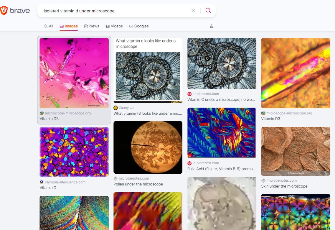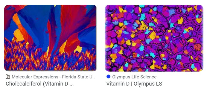 De acordo com o NIHdepois da descoberta da vitamina D de Ricketts mencionada acima, os cientistas “isolaram” a vitamina D. Isso levou-me a querer obter algumas fotos da vitamina D isolada para inserir aqui mesmo neste post do Substack para tornar o meu artigo o mais completo possível … o que parecia uma tarefa simples, mas rapidamente descobri que encontrar fotografias reais de vitamina D natural e não sintética isolada era tão difícil quanto encontrar uma fotografia tirada no “Espaço Exterior” (ou uma fotografia mostrando o vírus Covid isolado). Aqui está a minha jornada para encontrar uma fotografia de Vitamina D isolada: