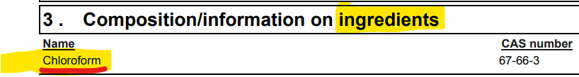 A MSDS afirma ainda que um dos ingredientes da Vitamina D3 Sintética é o Clorofórmio e que, em caso de ingestão, “consulte imediatamente um médico”: