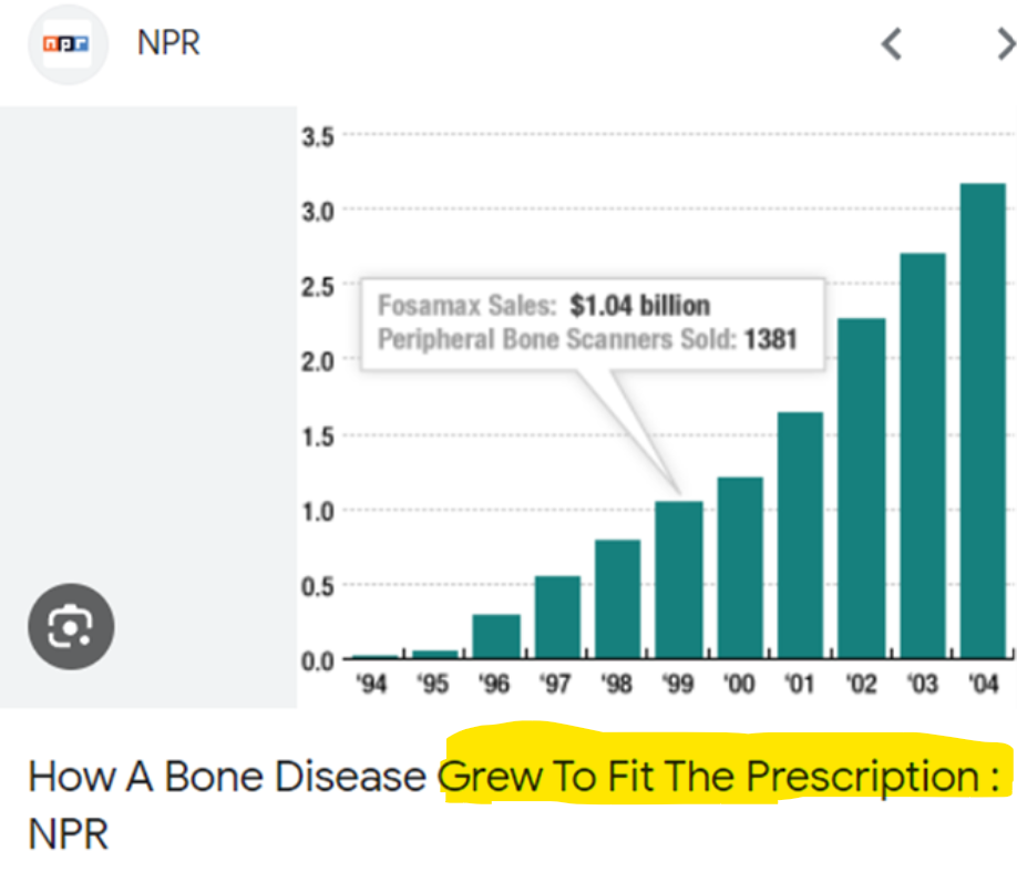 A Pharma não só tem uma vitamina química para lhe vender para aumentar os seus níveis de “vitamina” química no sangue, como também, quando a D3 extrai o cálcio dos seus ossos, exatamente como diz a MSDS, a Pfizer tem um comprimido para toda a vida para lhe vender para a sua osteoporose. Apesar de quase 100 ANOS de Vitamina D Sintética e outros químicos serem despejados nos alimentos e produtos lácteos para “fortificação” e “enriquecimento”, para além de serem tomados oralmente como suplemento, a Osteoporose passou de inexistente a um sucesso de bilheteira para a Pfizer. A NPR publicou um artigo sobre o medicamento milagroso da Pfizer intitulado “How Bone Disease Grew to Fit the Prescription” (Como a doença óssea cresceu para se adaptar à receita). Em apenas 10 anos, este medicamento passou de nada para mais de 3 BILHÕES DE DÓLARES em vendas num único ano (2004):