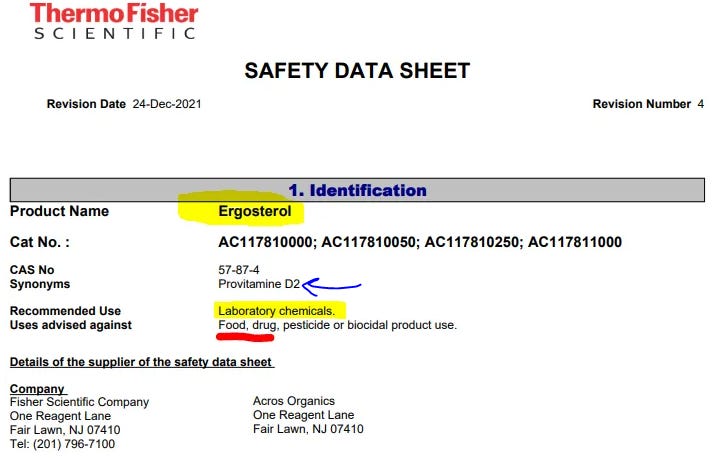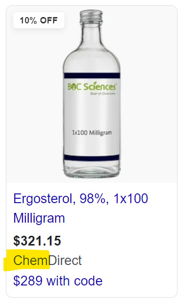 Quando olhei mais a fundo, descobri que o que está a ser utilizado não são fungos nem leveduras. O que estão a utilizar para as suas experiências é um químico conhecido como Ergosterol… TAMBÉM CONHECIDO COMO VITAMINA D2… e também não deve ser utilizado como alimento ou medicamento: