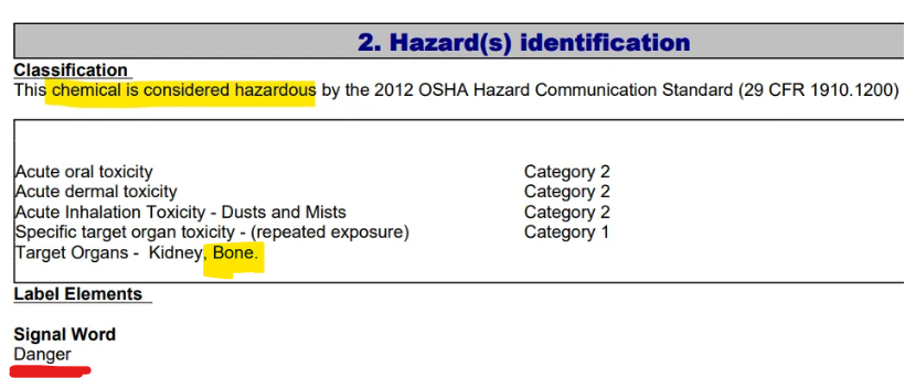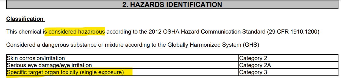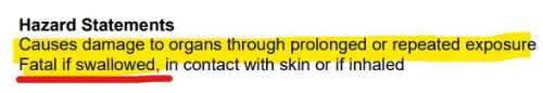 A “Toxicidade aguda” está listada na MSDS como sendo um perigo para a saúde de “Categoria 2” e de “Categoria 1”, mas principalmente de Categoria 2. Categoria 1 significa “Substâncias que, com base em provas de estudos efectuados em animais experimentais, se pode presumir que têm o potencial de serem nocivas para a saúde humana na sequência de uma única exposição”. A categoria 2 significa que “os produtos químicos e materiais apresentam riscos graves para a saúde, mesmo com uma exposição relativamente curta”: