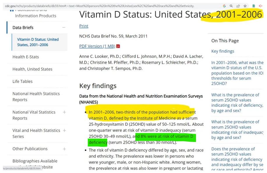 Em 2006, antes de a Pfizer e a Big Pharma entrarem no mercado das vitaminas, apenas 8% das pessoas eram consideradas “em risco de deficiência de vitamina D”, de acordo com o CDC: