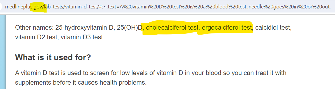 Não se pode inventar esta merda: Como se as coisas não pudessem ficar ainda mais bizarras com todo este tópico, descobri que, no site do governo dos EUA, MedlinePlus.govo que eles estão a testar no nosso sangue é o maldito químico sintético Vitamina D (Colecalciferol) e o químico sintético D2 (Ergosterol)… e, se formos considerados pobres nestes químicos, a resposta é “tratar o problema com suplementos” (químicos… os mesmos químicos perigosos que eles vendem para não consumir…):