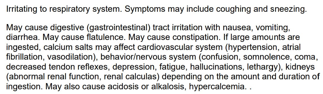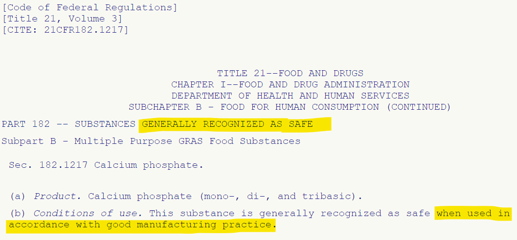 De facto, é considerado tão geralmente reconhecido como seguro pela FDA que este químico perigoso é considerado um suplemento de cálcio, pelo que, nos Estados Unidos, é despejado em alimentos processados que requerem enriquecimento. Isto significa que está nos cereais, na farinha, nas massas, etc.