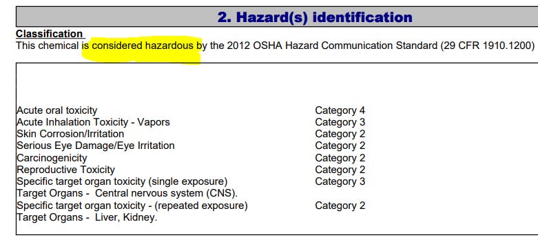 Embora seja perigoso de acordo com o fabricante do produto químico, a FDA declarou-o como sendo geralmente reconhecido como seguro (“GRAS”) quando “utilizado de acordo com as boas práticas de fabrico”… o que significa isto exatamente? Não faço a mínima ideia.
