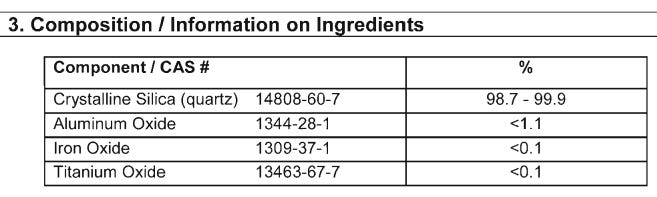 A seguir vem a sílica. De acordo com OSHA.gov, “A sílica cristalina é um mineral comum encontrado na crosta terrestre. Materiais como areia, pedra, betão e argamassa contêm sílica cristalina”. Também é utilizada para fabricar produtos como vidro, cerâmica, tijolos e pedra artificial… mas esqueceram-se de mencionar que é utilizada para fabricar vitaminas sintéticas. Será que precisamos de ver uma Ficha de Dados de Segurança do Fabricante para algo que é utilizado para fazer pedra falsa? Provavelmente não. Mas se estiver curioso, a sílica pode conter mais de 1% de óxido de alumínio, bem como quantidades vestigiais de óxido de ferro e óxido de titânio, mas é uma percentagem muito pequena, por isso não se preocupe, certo?