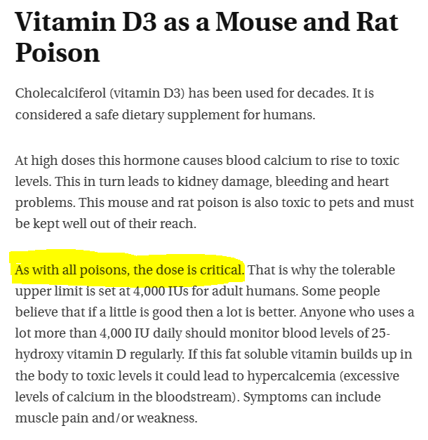 Além disso, a forma como o colecalciferol sintético mata os ratos é exatamente idêntica à forma como o colecalciferol sintético prejudica os seres humanos se for tomado em “excesso” ou durante demasiado tempo. Parece-me que a única diferença entre o rato morto e o ser humano vivo é a “dose tolerável” do veneno. Isto levou-me à minha próxima pergunta: