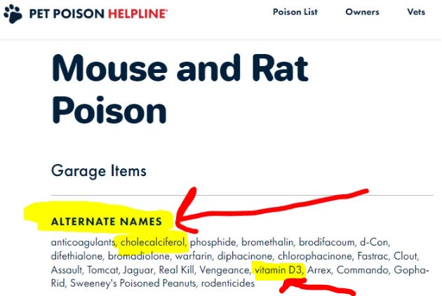 De acordo com a 24/7 Pet Poison Helplineo “colecalciferol” sintético não está apenas no veneno de rato, é outro nome para o veneno de rato. “VITAMINA D3” TAMBÉM É OUTRO NOME PARA VENENO DE RATO:
