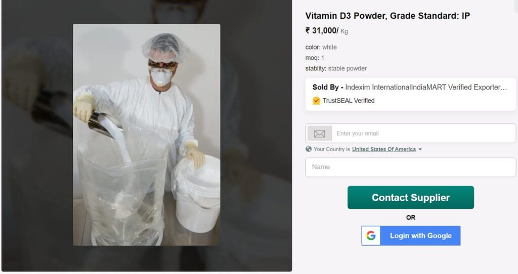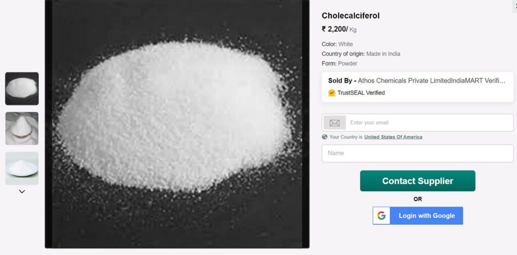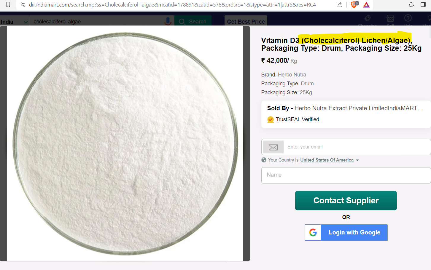 Aqui estão tambores inteiros de 25 kg de colecalciferol de algas à venda nas mesmas fábricas de vitaminas químicas da Índia por aproximadamente 500 dólares americanos: