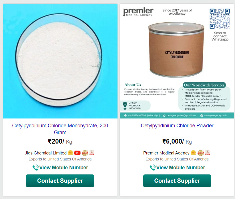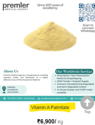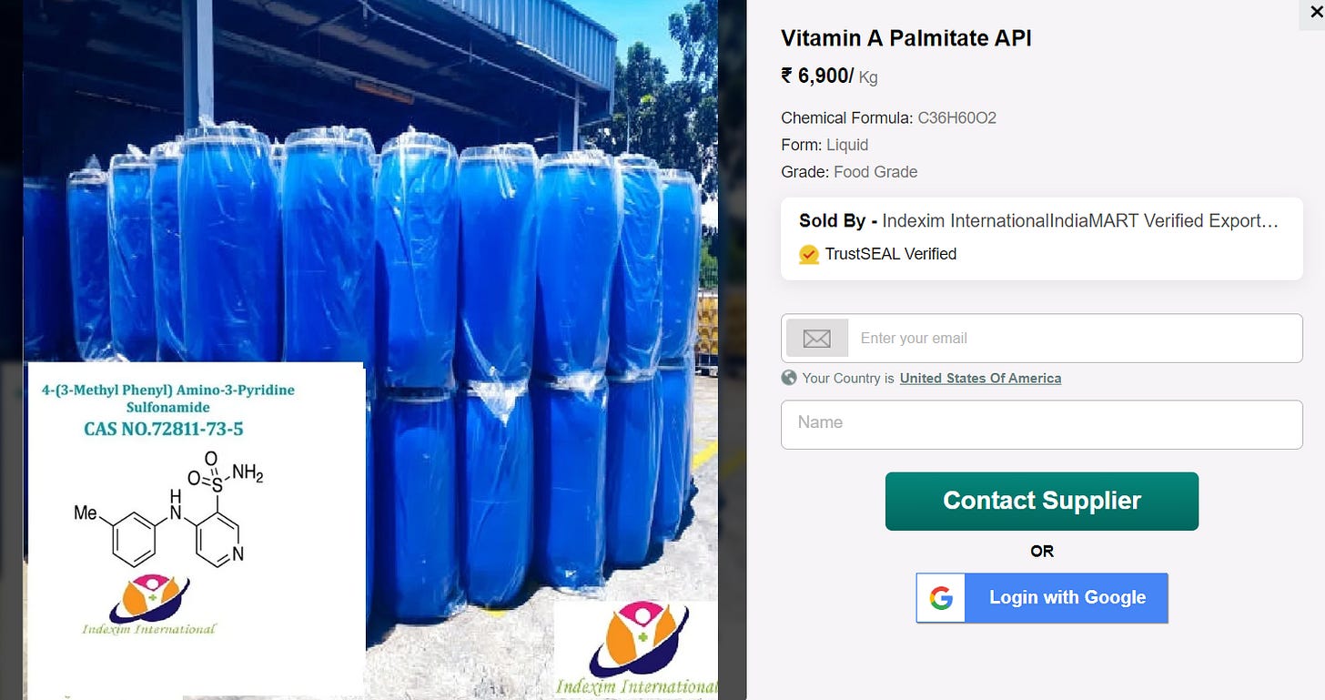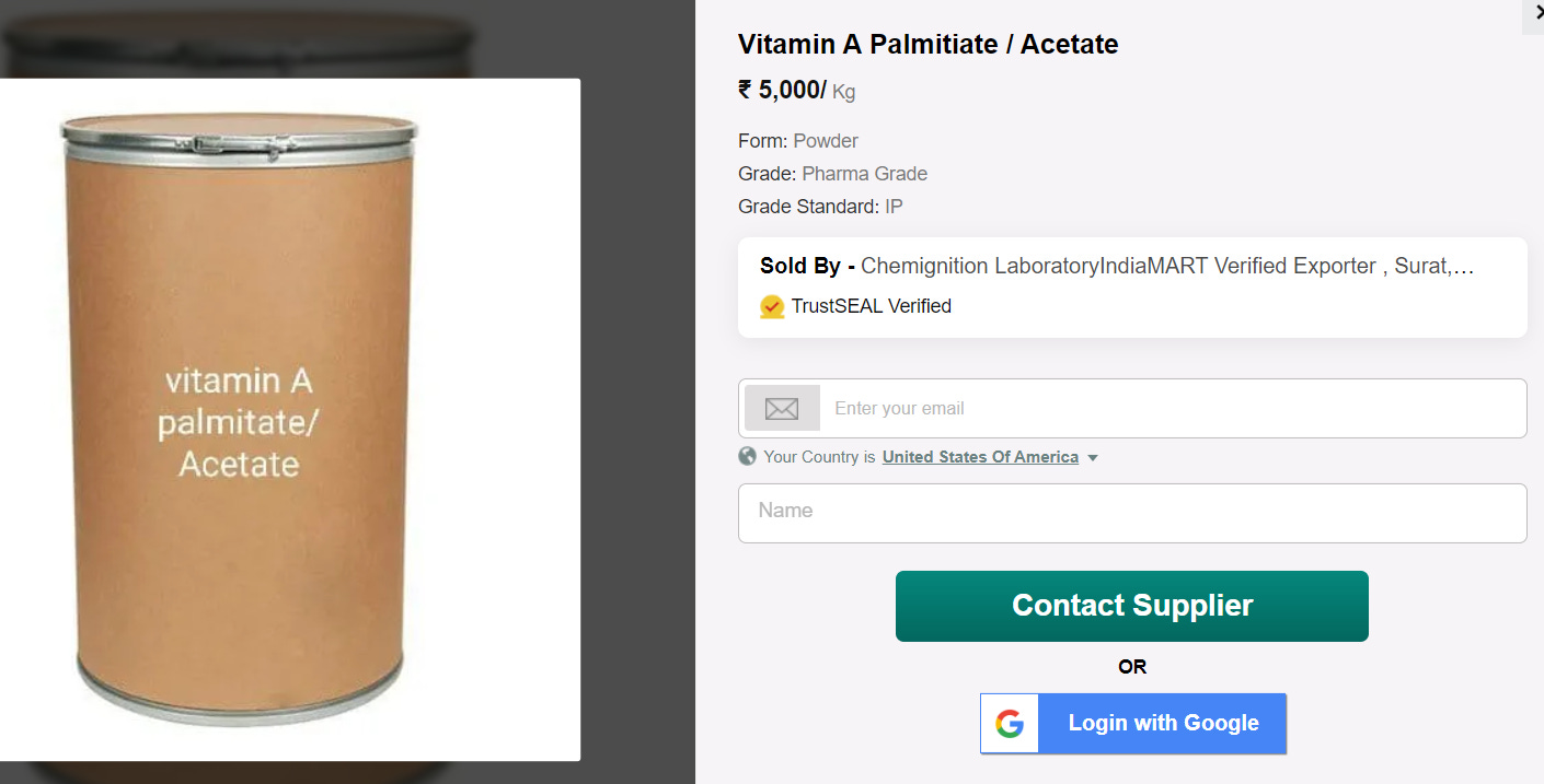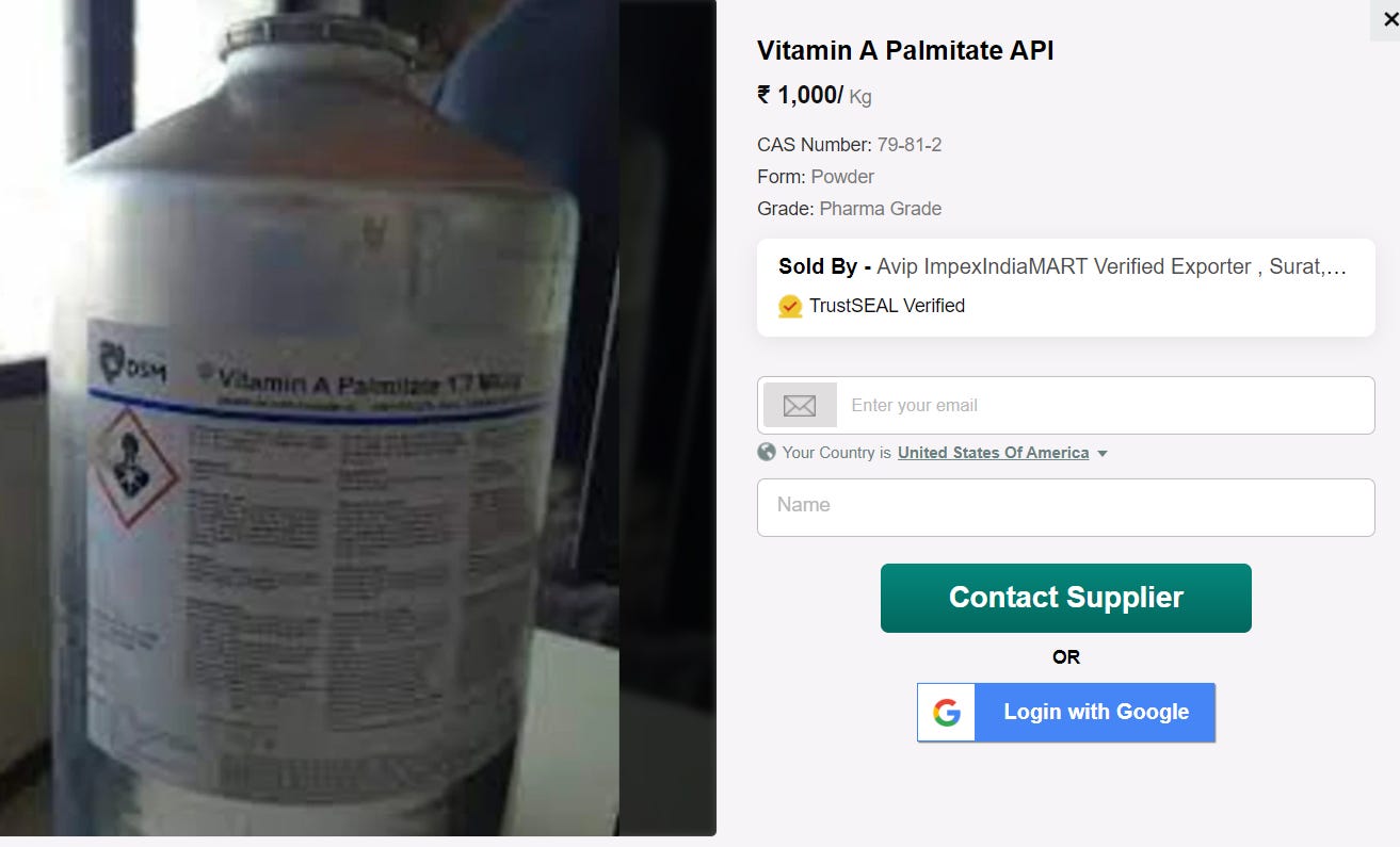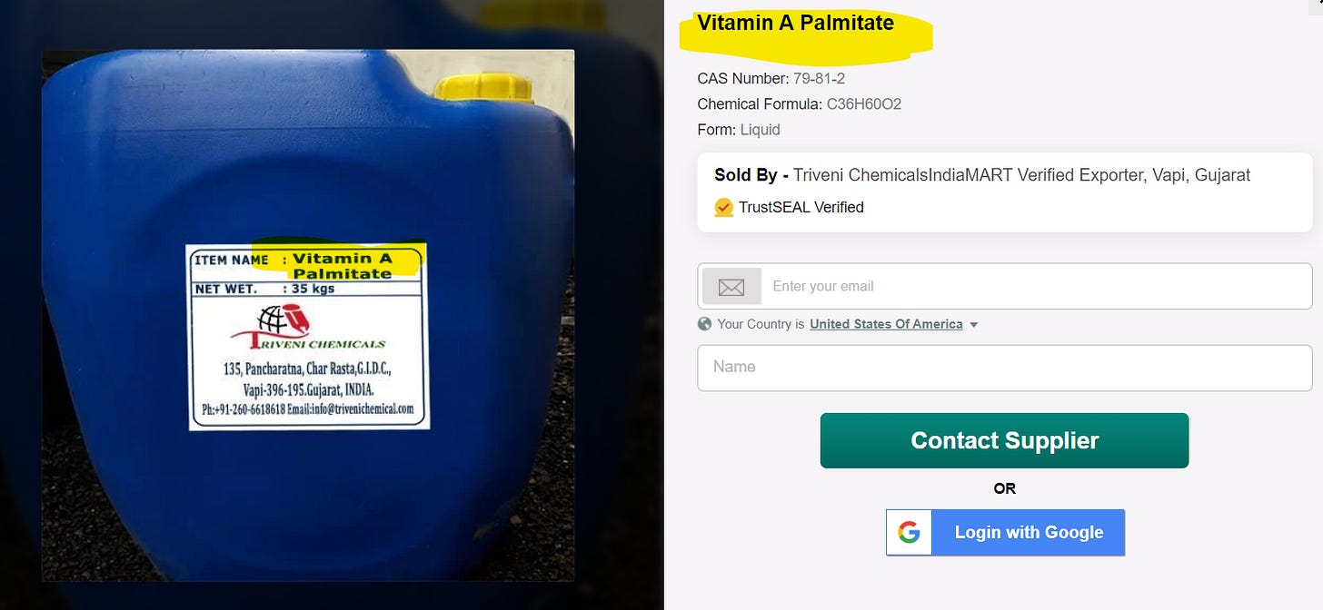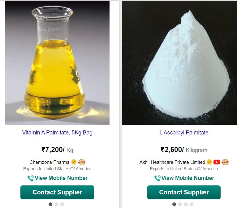 No IndiaMart, fiz uma pesquisa por “Palmitato”. Aqui descobrimos que pode ser comprado em pó ou líquido, dependendo se o fabricante de vitaminas quer fazer gotas ou comprimidos ou misturá-lo em alimentos ou bebidas:
