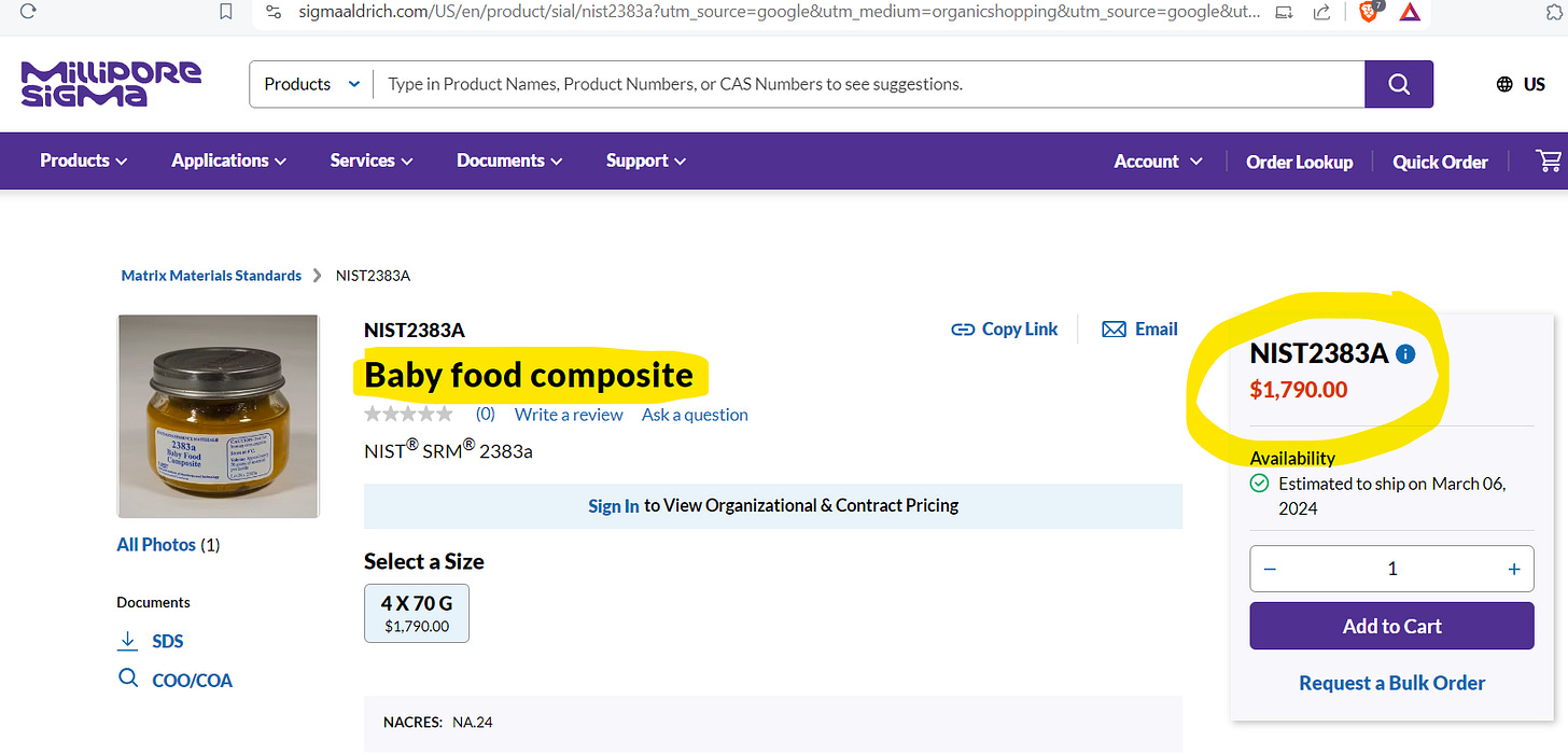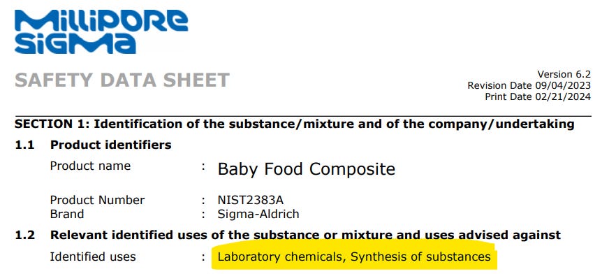 Sabiam que a empresa química da Merck, Millpore Sigma, vende “Composto para comida de bebé” por 1.790 dólares?