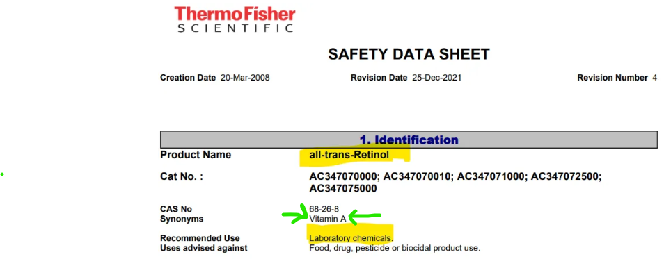 O documento do programa de fortificação das Nações Unidas prossegue dizendo que pode ser difícil fortificar alimentos com vitamina A porque os químicos não reagem bem ao calor. Os químicos? Da última vez que verifiquei, as frutas e os legumes não são químicos, por isso vamos tentar perceber o que é a Vitamina A, em termos dos químicos que nos estão a ser vendidos como suplementos: