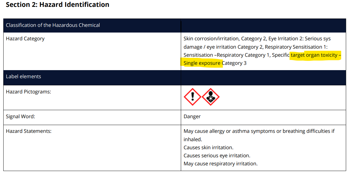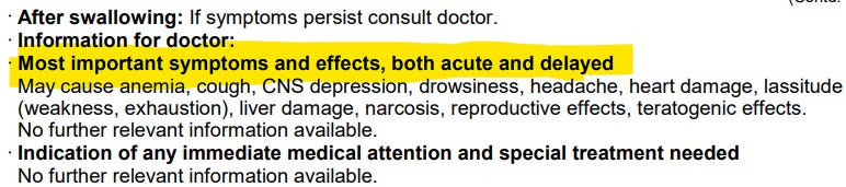 Se ler mais abaixo na ficha de dados de segurança, esta contém mais pormenores sobre os sintomas da exposição, o que me surpreendeu bastante, porque pensei que os outros avisos já eram suficientemente maus. Não estava à espera que ficasse muito pior. Aqui estão alguns sinais de alerta seguidos da lista de sintomas de exposição: