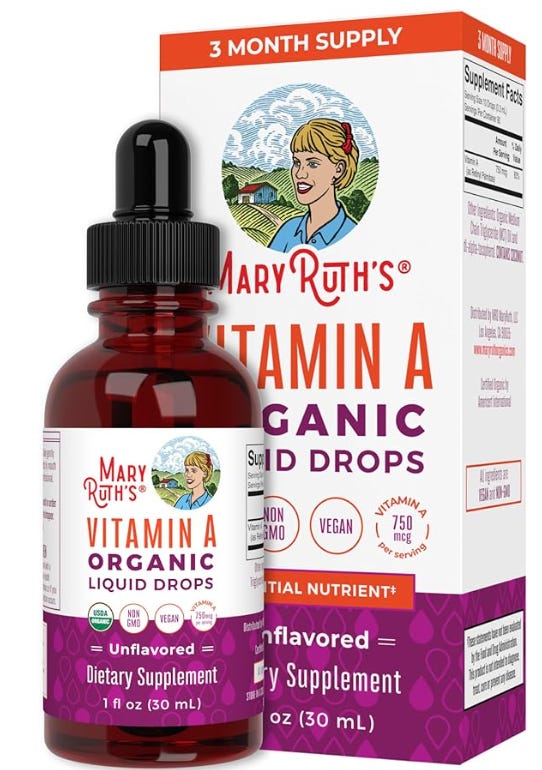 No meu post Vitamina B é Cianeto, partilhei convosco que a Mary Ruths era a minha marca de confiança porque está rotulada como “orgânica”, e eu pago o dinheiro extra para evitar químicos. No entanto, no caso da Vitamina B da Mary Ruths, continha o mesmo carcinogéneo perigoso derivado de cianeto B12 que qualquer outro produto. A única coisa “orgânica” nesse frasco de B12 era o “sabor a ananás”. Vamos ver se a Vitamina A da Mary’s é o mesmo esquema: