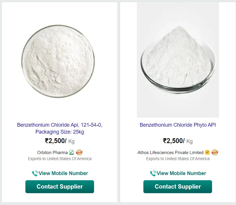 Agora que sabemos o que procuramos, um produto químico chamado Palmitato, volto ao IndiaMart.com, um site que tem sido crucial para as minhas investigações sobre Vitamina D, C, B e Ómega-3. O IndiaMart é um mercado para fabricantes e compradores de produtos químicos a granel. Gosto do site porque nos dá a oportunidade de ver os produtos químicos reais com que estamos a ser alimentados e, por vezes, podemos encontrar os rótulos dos ingredientes. E, como quase todas as vitaminas, suplementos, produtos farmacêuticos, aditivos alimentares e outros produtos químicos “saudáveis” são fabricados na Índia e na China, podemos utilizar o IndiaMart para ver muitas variedades diferentes do produto químico, como pós versus líquidos e bidões versus caixas.