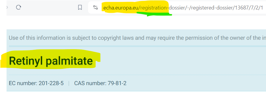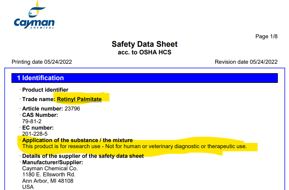 Reparei que, na lista de sinónimos, o nome de topo é “palmitato de retinilo”, por isso fui buscar a Ficha de Dados de Segurança dos Fabricantes (MSDS) do Palmitato de Retinilo para tentarmos descobrir alguns ingredientes.