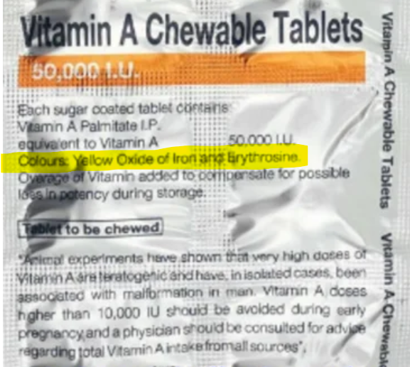De acordo com este suplemento de Vitamina A, os corantes incluem Óxido Amarelo de Ferro e Eritrosina: