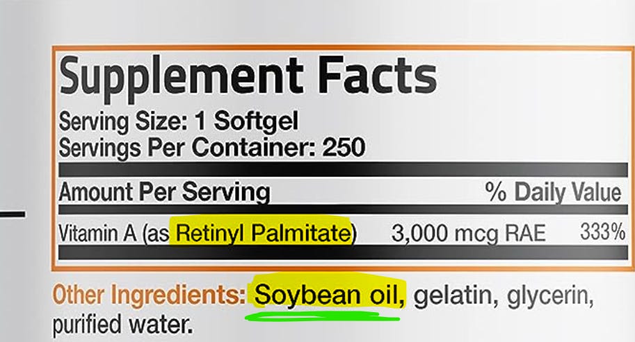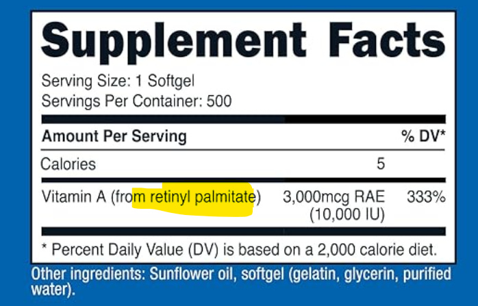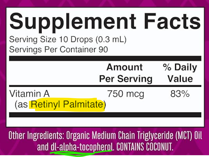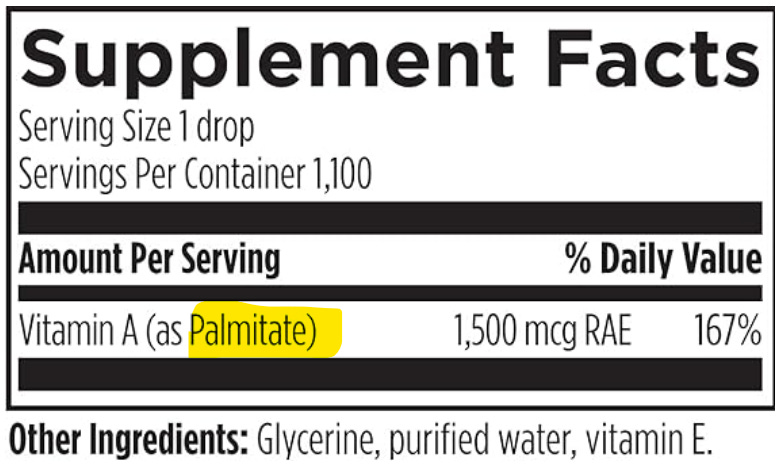 Assim, todos estes suplementos, quer para adultos, mães grávidas, crianças ou bebés, são Vitamina A como “Palmitato de Retinilo” ou “Palmitato”. Mais tarde, descobri que Retinilo (também escrito “Retinol”) é outro nome para Palmitato, que é outro nome para Vitamina A. Portanto, sempre que vir as palavras Vitamina A, Palmitato, Palmitato de Vitamina A, Retinil ou Retinol, todas elas significam a mesma coisa. Em breve, mostrar-vos-ei esta investigação. Mas primeiro, o que é este “Palmitato” que estamos a consumir como Vitamina A?