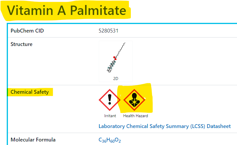 Sim, o “Palmitato de Vitamina A” é um perigo grave para a saúde. Não é apenas um perigo para a saúde, é um SÉRIO PERIGO PARA A SAÚDE… o que é estranho, porque acabámos de saber pela Healthline que este químico é ótimo para a nossa saúde (woo hoo!)