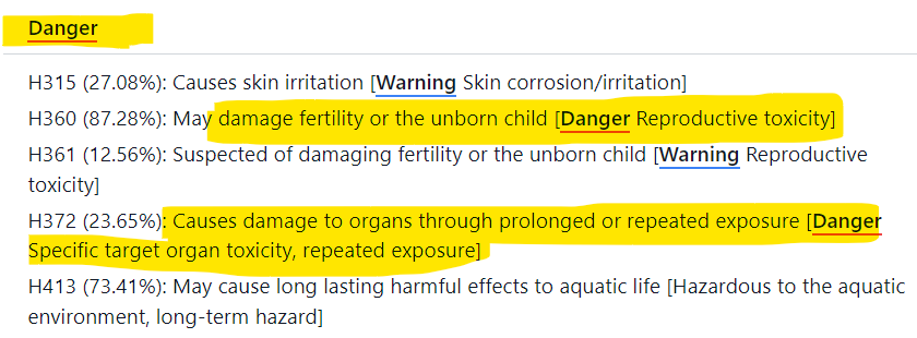 É muito perigoso, pelo que está classificado como um perigo para a saúde de categoria 2, o que significa que pode causar danos graves e permanentes com uma utilização prolongada ou repetida: