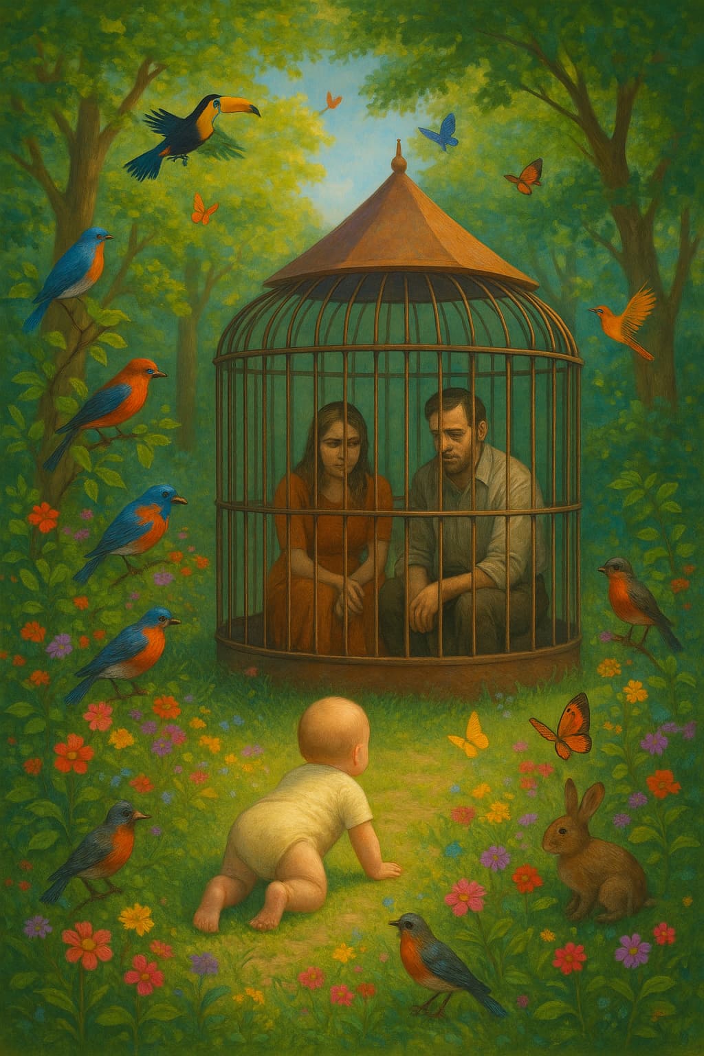 Esta imagem não é apenas simbólica. Vê a floresta vibrante, cheia de pássaros coloridos, árvores vivas, o mundo em festa. E no meio, uma clareira. Nela, uma gaiola com telhado. Dentro, o pai e a mãe. Sentados. Submissos. Condicionados. E o bebé… vai a gatinhar para a gaiola, como quem procura instintivamente os que ama, mesmo que estejam aprisionados.