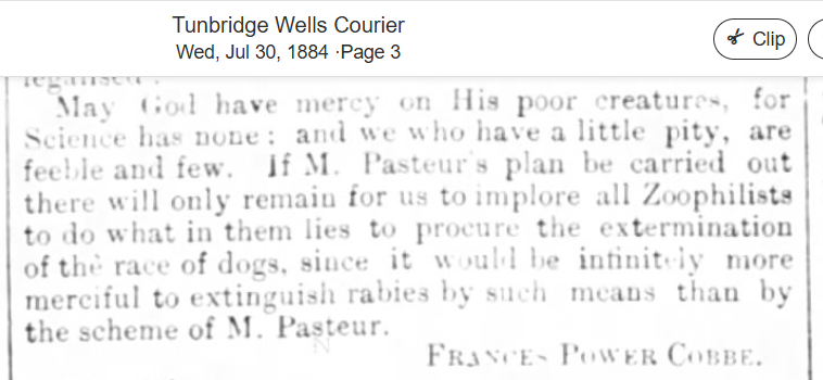 Em 1884, apareceu um artigo no jornal que dizia: “Que Deus tenha piedade das Suas pobres criaturas, pois a Ciência não tem nenhuma; e nós, que temos um pouco de piedade, somos fracos e poucos”. O artigo prossegue dizendo que seria mais humano exterminar toda a raça de cães do que fazer o que Pasteur está a fazer a todas estas criaturas sob o pretexto da “raiva”.