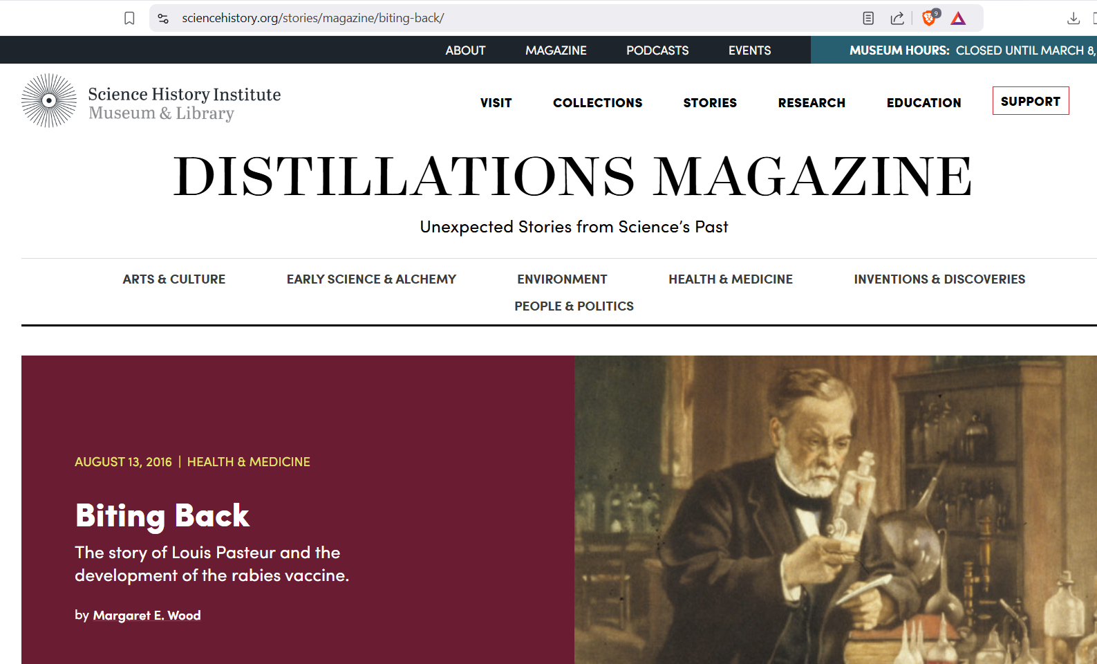 Deixem-me dizer-vos o que a Wikipedia diz sobre o desenvolvimento da vacina contra a raiva de Louie: “O laboratório de Pasteur produziu a primeira vacina contra a raiva usando um método desenvolvido pelo seu assistente Roux, que envolvia o crescimento do vírus em coelhos e, em seguida, enfraquecendo-o através da secagem do tecido nervoso afetado… A vacina tinha sido testada em 50 cães antes do seu primeiro ensaio em humanos” – Bem, isso não é muito descritivo, mas vejo que a Wiki incluiu duas fontes sobre o desenvolvimento da vacina de Pasteur. Vejamos o que podemos aprender com estas fontes. Aqui está a primeira: