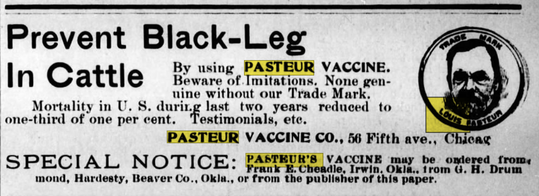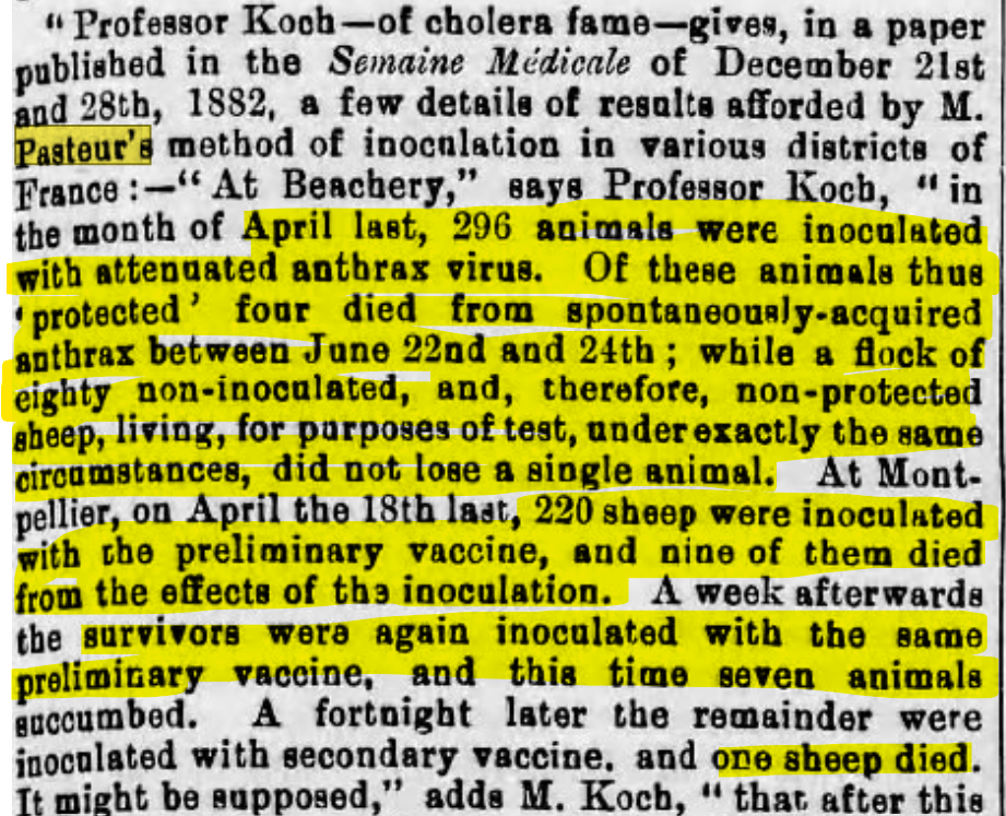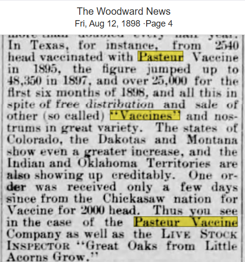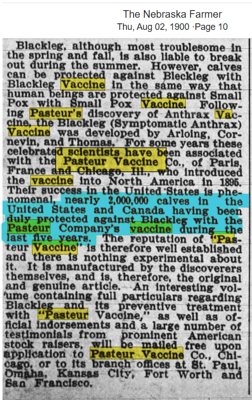 Esta vacina foi muito popular. Como podemos ver neste artigo de jornal, em 1895 apenas 2.540 animais foram vacinados com a poção de Pasteur, mas em 1897, quase 50.000 receberam as injecções.