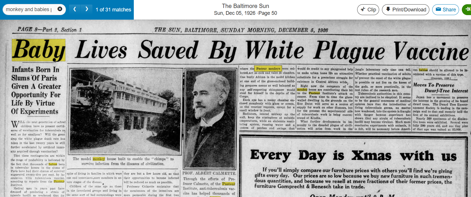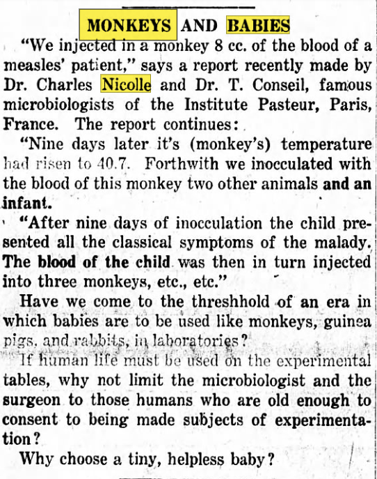 Em 1921o Instituto Pasteur estava envolvido com o sarampo. Os cientistas do Pasteur tiraram sangue de um doente com sarampo, injectaram-no num macaco, esperaram nove dias, retiraram o sangue desse macaco e injectaram-no em “dois outros animais e num bebé”. O público ficou indignado com a experimentação humana no bebé e muitos escreveram ao jornal para exprimir a sua raiva.
