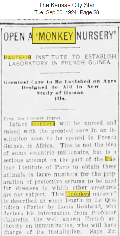 Em 1922, o Instituto estava a torturar tantos primatas que foi necessário abrir uma quinta para macacos. Esta quinta abatia os macacos para obter os seus ossos, sangue e tecidos, para além de realizar experiências horríveis com eles.
