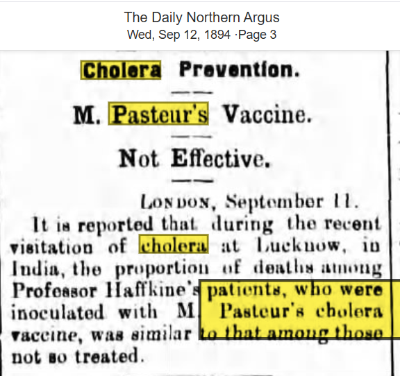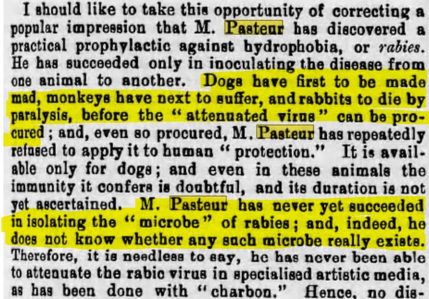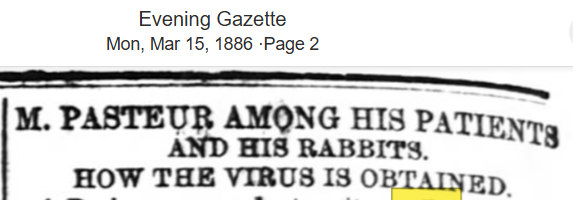 O artigo resume o desenvolvimento da vacina de Louie afirmando: “…Em 1880 ele começou a estudar a raiva, mas em 1885 sua vacina contra a raiva não havia sido totalmente testada, mesmo em animais. Embora a certeza da infeção pudesse ser estabelecida apenas quando os sintomas aparecessem, Pasteur acreditava que devido ao número de mordidas no corpo de Joseph, a morte era quase certa… Com aparentemente pouco a perder, Pasteur injetou Joseph diariamente com uma série de medulas espinhais progressivamente menos dessecadas retiradas de coelhos infectados com Raiva – passando das medulas mais secas e menos virulentas para as mais frescas e mais virulentas. Joseph nunca desenvolveu sintomas, e Pasteur tornou-se um herói internacional”. – Medula espinhal de coelho? O quê? Isso também não ajudou em nada, mas estas são as fontes fornecidas pela principal enciclopédia moderna do mundo. Agora vamos ver o que podemos aprender com os arquivos de jornais antigos que, graças ao vosso excelente apoio, consegui pagar uma assinatura.