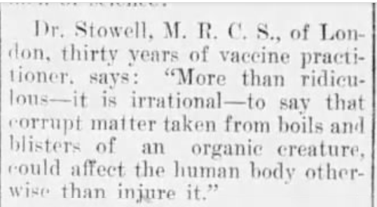 “É mais do que ridículo – é irracional – dizer que a matéria corrupta retirada dos furúnculos e bolhas de uma criatura orgânica poderia afetar o corpo humano de outra forma que não a de o ferir” – Dr. Stowell, MRCS de Londres, ao falar da sua experiência de trinta anos como praticante de vacinas.