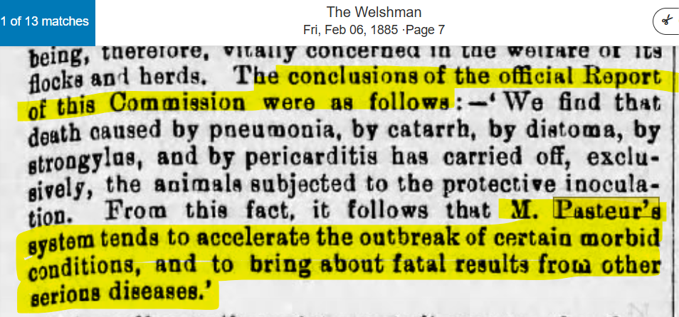 Pasteur começou então a vender uma vacina contra a “pata negra” para o gado. Como discutimos no meu artigo EXPOSTO: O Golpe do Vírus, foi durante esses mesmos anos que o gado começou a ser alimentado com resíduos industriais como uma alternativa barata aos alimentos integrais. Os animais ficaram terrivelmente doentes e subnutridos e a culpa foi dos germes/bactérias/vírus. Isto permitiu que homens como Pasteur aparecessem e solicitassem a sua imundície misturada com venenos.